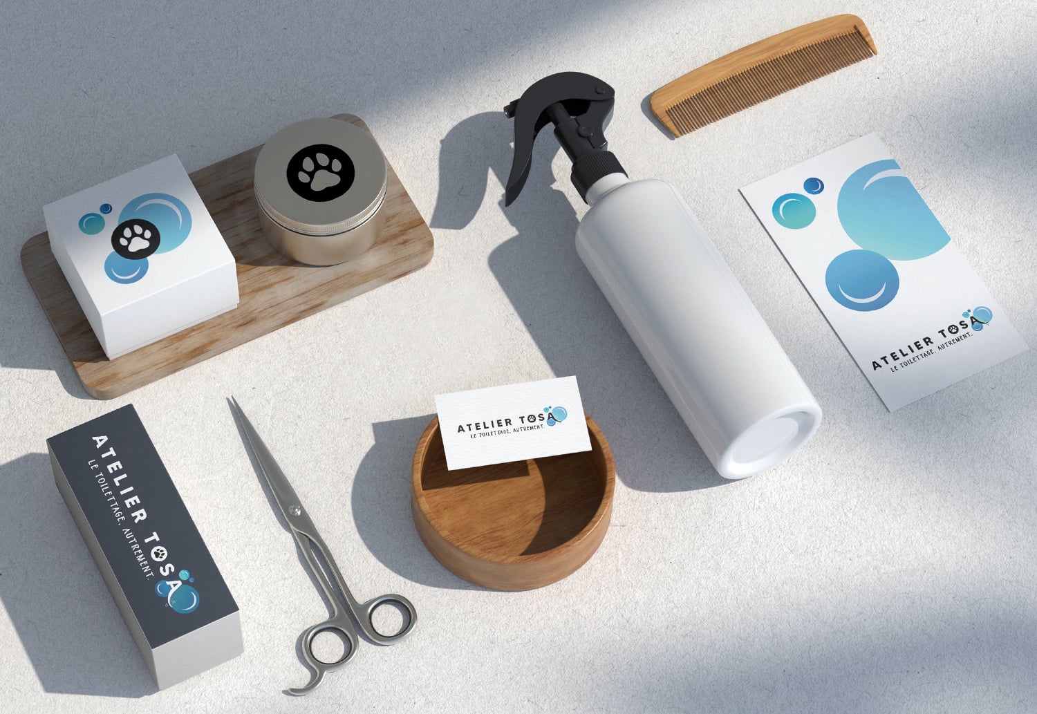Réalisation de l'identité visuelle de l'Atelier Tosa, salon de toilettage pour chien.#identitévisuelle#logo